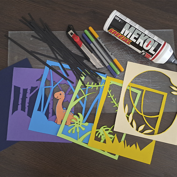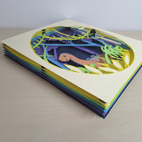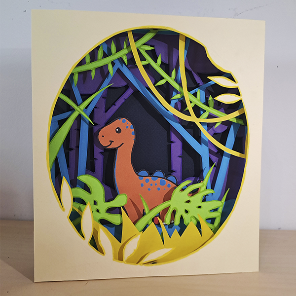 3D izdelek dinozavrčka v jajcu izrezan in narejen iz papirja na roke.